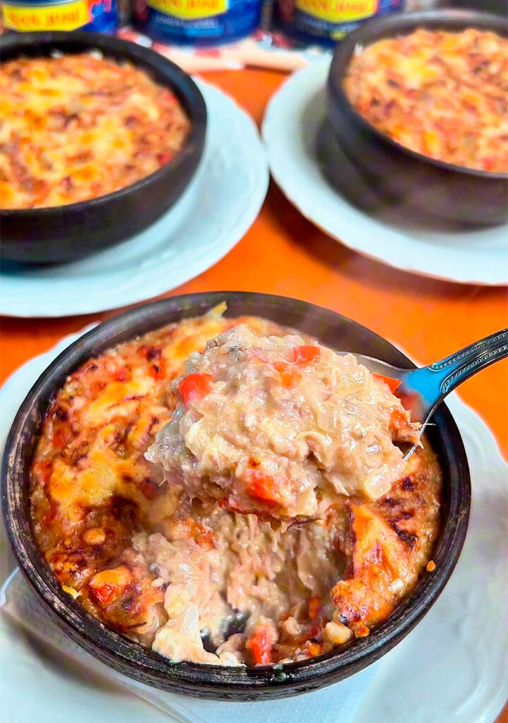 Paso 7: Distribuir en recipientes individuales para horno las papas y huevos y verter la sopa de charqui