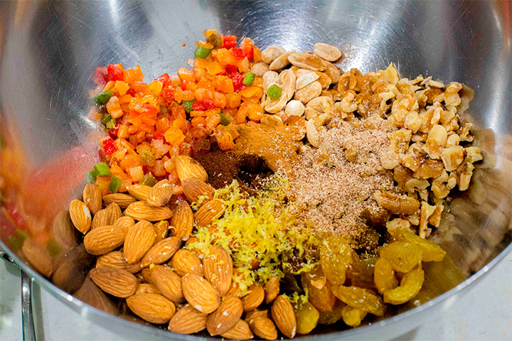 El día anterior poner a macerar las pasas, nueces, maní, almendras y fruta confitada en el ron, la ralladura de limón y las especies. Revolver bien. Cubrir con plástico de cocina y dejar reposar toda la noche.