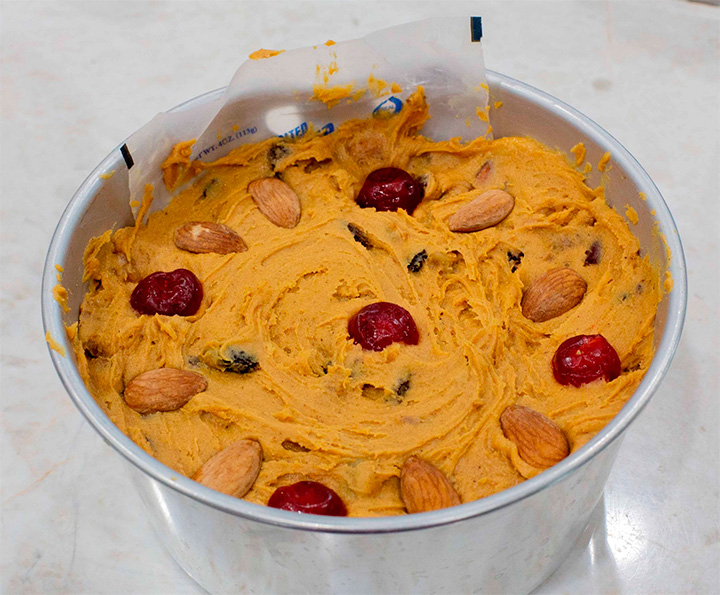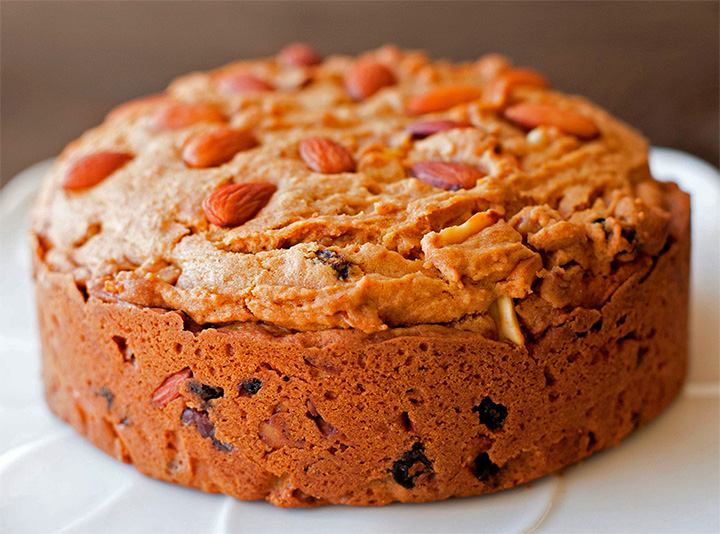 Se incorporaron frutas confitadas, pasas, nueces, y especias como clavo de olor, nuez moscada y canela, logrando un bizcocho más oscuro y húmedo.