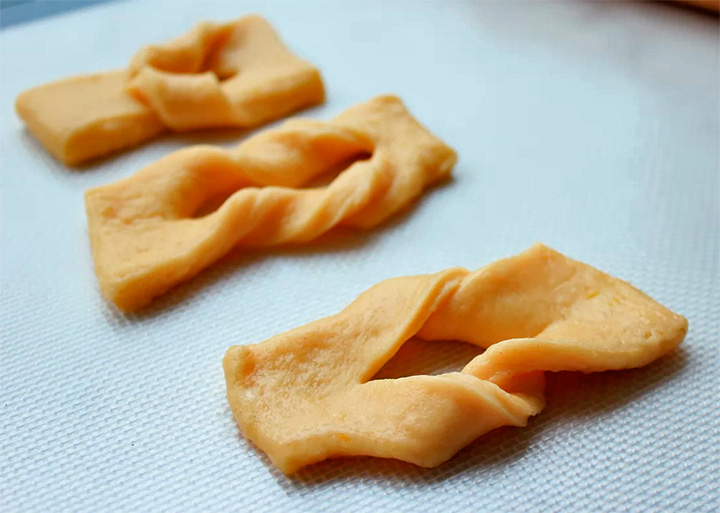 - Forma: Su forma característica, con un nudo o corte central, se debe a que se pasa un extremo de la masa a través de un tajo en el centro.