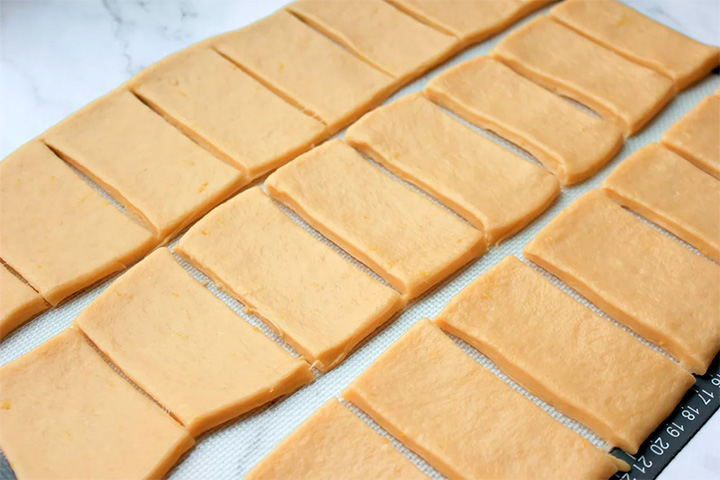 - Estira con un rodillo la masa hasta formar un rectángulo de 50 x 30 x 0,5 cm. Divide en rectángulos de 5 x 10 cm